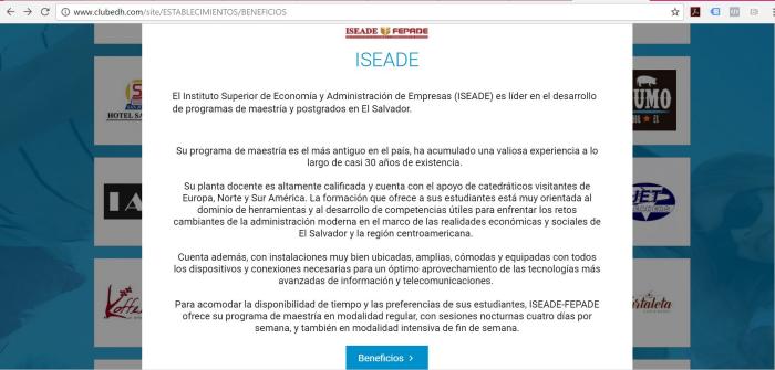 Con el objetivo de dar a conocer sus servicios educativos a más personas, el 28 de octubre de 2016, el Club de Lectores de El Diario de Hoy –EDH- e ISEADE firmaron un convenio, por medio del cual los miembros del Club de Lectores interesados en tomar estos postgrados especializados, podrán obtener un importante 10% de descuento, al cumplir todos los requisitos establecidos.