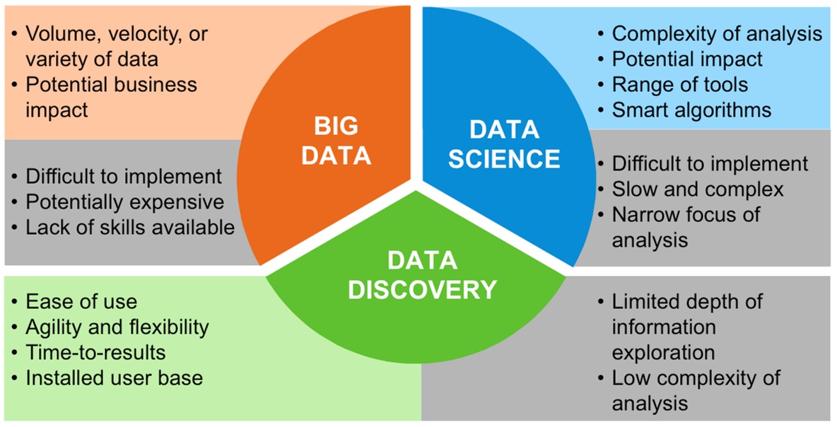 De acuerdo con Gartner Corp., Big Data Discovery es la tendencia predominante en Analiticas de Data en los próximos años; es la combinación lógica de Big Data, Data Science, Business Intelligence,y Data Discovery; donde cada una estas experimentó un crecimiento explosivo en sus respectivas etapas; sin embargo, cada una presenta serias deficiencias en términos de eficacia y eficiencia. Hay claras desventajas de unas que son las ventajas de las otras y viceversa; son categóricamente complementarias y de lo cual surge Big Data Discovery, cuyas herramientas serán accesibles, tecnológicamente, a más usuarios, con un mayor poder de manipulación de la información por parte de estos, sin importar su capacidad tecnológica o la procedencia de la información.
