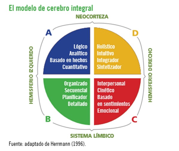 Ned Herrmann elaboró un modelo que se inspira en los conocimientos del funcionamiento cerebral. Él lo describe como una metáfora y hace una analogía de nuestro cerebro con el globo terrestre con sus cuatro puntos cardinales. A partir de esta idea representa una esfera dividida en cuatro cuadrantes, que resultan del entrecruzamiento de los hemisferio izquierdo y derecho del modelo Sperry, y de los cerebros cortical y límbico del modelo McLean. Los cuatro cuadrantes representan cuatro formas distintas de operar, de pensar, de crear, de aprender y, en suma, de convivir con el mundo.