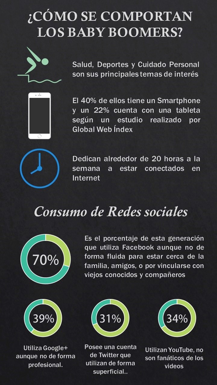 Según estudio del Global Web Index, algunos datos estadísticos importantes en el comportamiento de los Baby boomers, con respecto al uso de tecnología, son los siguientes: