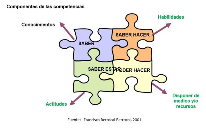 Así mismo, los componentes que integran a las competencias son: “conocimientos: saber; habilidades: saber hacer; actitudes: saber estar; y no debemos perder de vista un cuarto componente, el cual es ajeno a la persona, depende más de la empresa y tiene que ver con disponer de los medios o recursos: poder hacer”, (Berrocal, 2001:24).