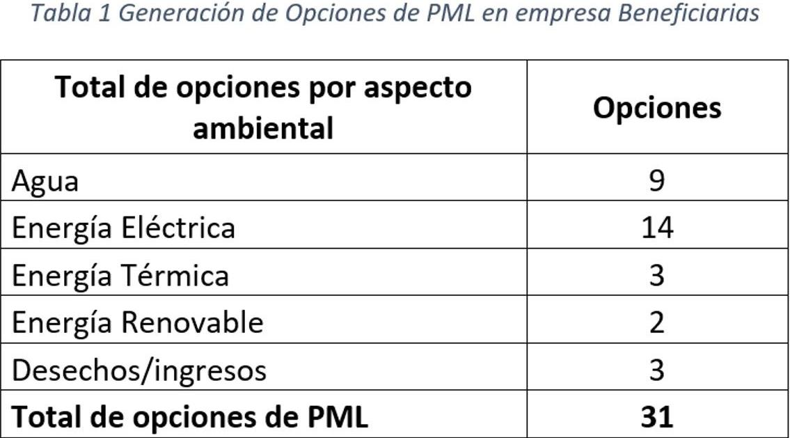 En total se han generado 31 opciones de Producción Más Limpia (PML) en las 6 MPYMEs que están trabajando en el proyecto estas se desglosan en opciones de PML para: Gestión de Agua, Energía Eléctrica, Térmica, Energías Renovables y gestión de desechos, y que se presentan en la siguiente tabla: