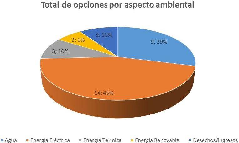 De la ilustración anterior se observa que el 45% de las opciones de PML generadas corresponde al aspecto ambiental energía eléctrica seguido de un 29% de opciones de gestión y/o optimización de agua en las empresas beneficiarias.
