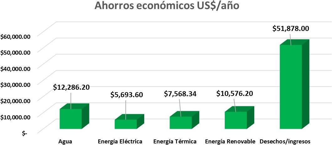 En cuanto a los beneficios económicos, en el siguiente grafico se puede observar que los mayores ahorros se logran en el aspecto reutilización, minimización y/o venta de desechos con aproximadamente 51,878 US$/año, seguido por el aspecto ambiental agua con ahorros de 12,286 US$/año y tercero aparece Energías Renovables con 10,576 US$/año esto referido principalmente a implementación de Sistemas Solares Fotovoltaicos para genera electricidad en las empresas.