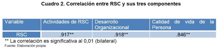 Se puede apreciar en el cuadro 2 que existe una estrecha correlación entre la mayoría de ítems que miden los 2 componentes de la Responsabilidad Social Corporativa. Es decir, a mayor RSC mayor cantidad de acciones encaminadas al desarrollo social, mayor desarrollo y estabilidad corporativa de la organización y mayor calidad de vida de sus empleados; en contraste, aquellas empresas que muestran poca RSC en sus prácticas corporativas, indican pocas actividades encaminadas a aspectos de desarrollo social, menor estabilidad y desarrollo corporativo y una menor calidad de vida percibida por sus empleados.