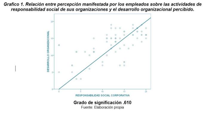 El primer gráfico nos muestra cómo la relación positiva que existe entre las Actividades de RSC influye en el desarrollo organizacional percibido por los empleados. (Gráfico 1)